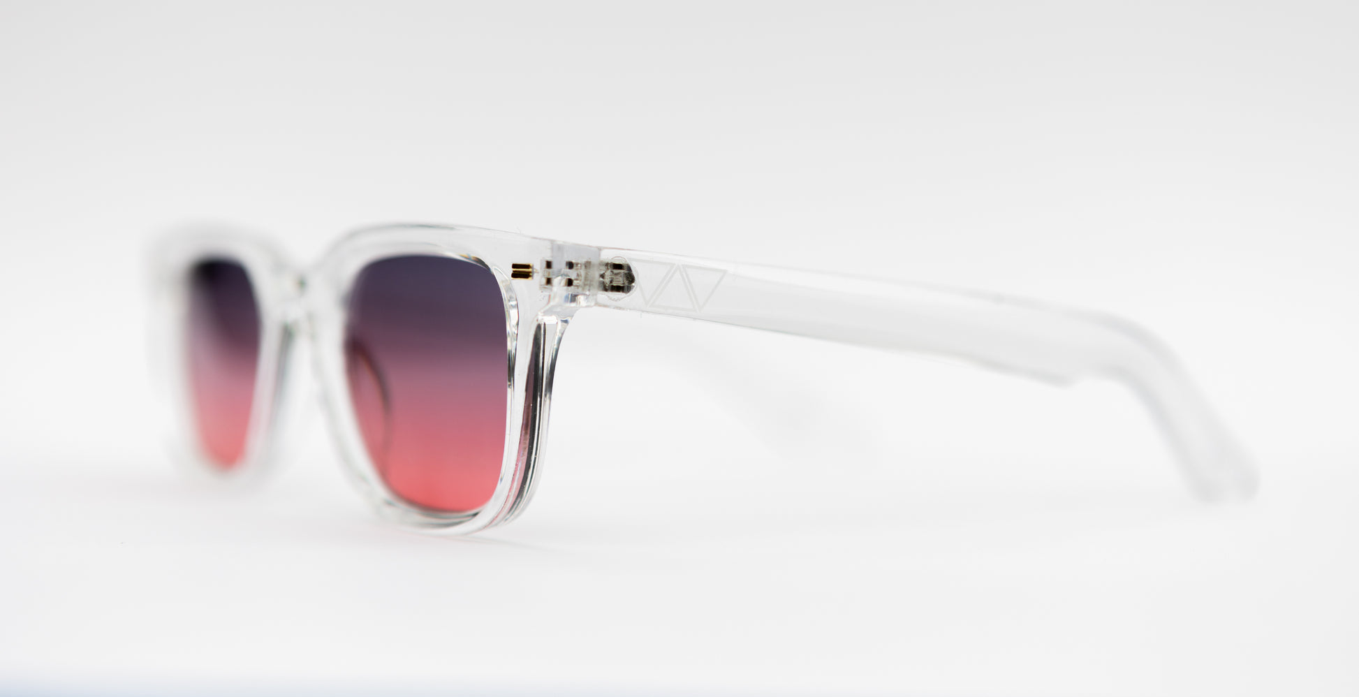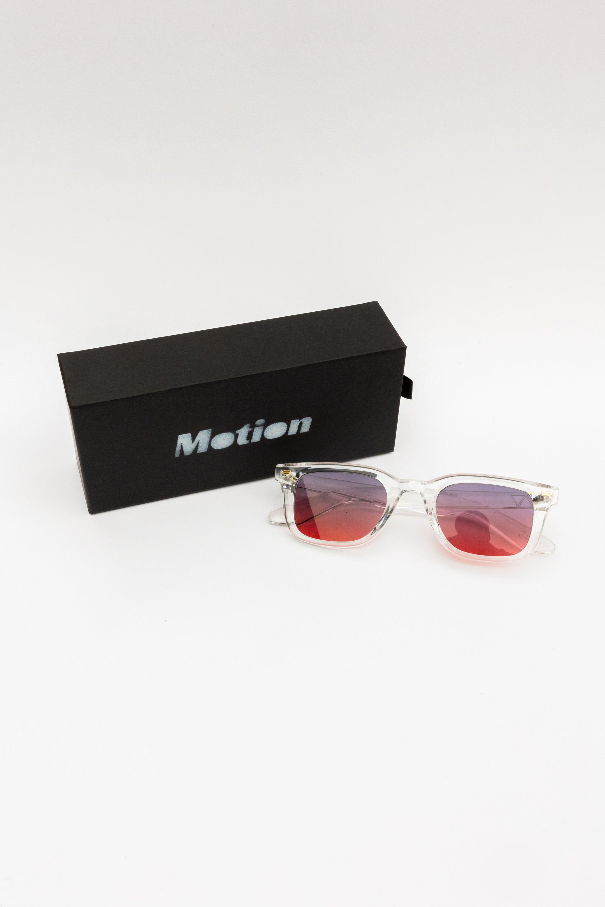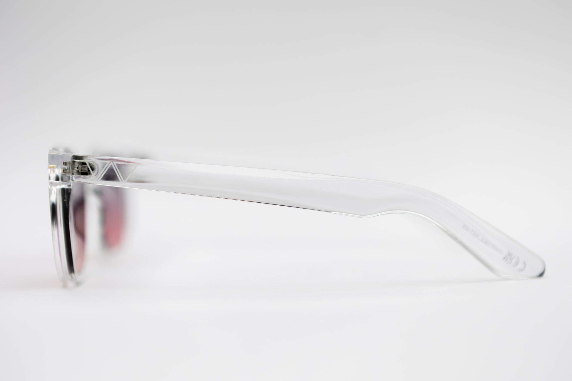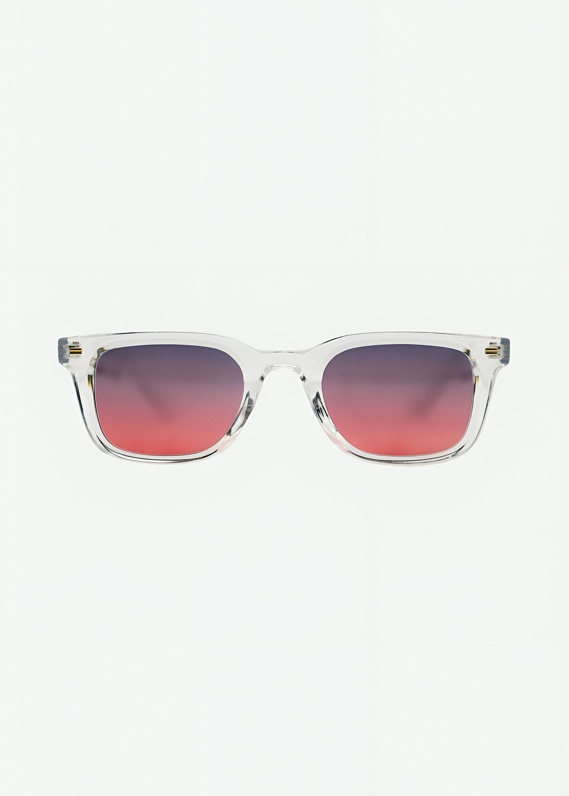 Zonnebril met 100% UV-bescherming (categorie 2), rode polycarbonaat lenzen en transparant montuur van 100% gerecycled polyester (rPC). Geschikt voor mannen en vrouwen, afmetingen: 14,4 cm breed, 4,3 cm hoog, pootjes 14,2 cm, lensbreedte 6 cm, brug 2 cm.